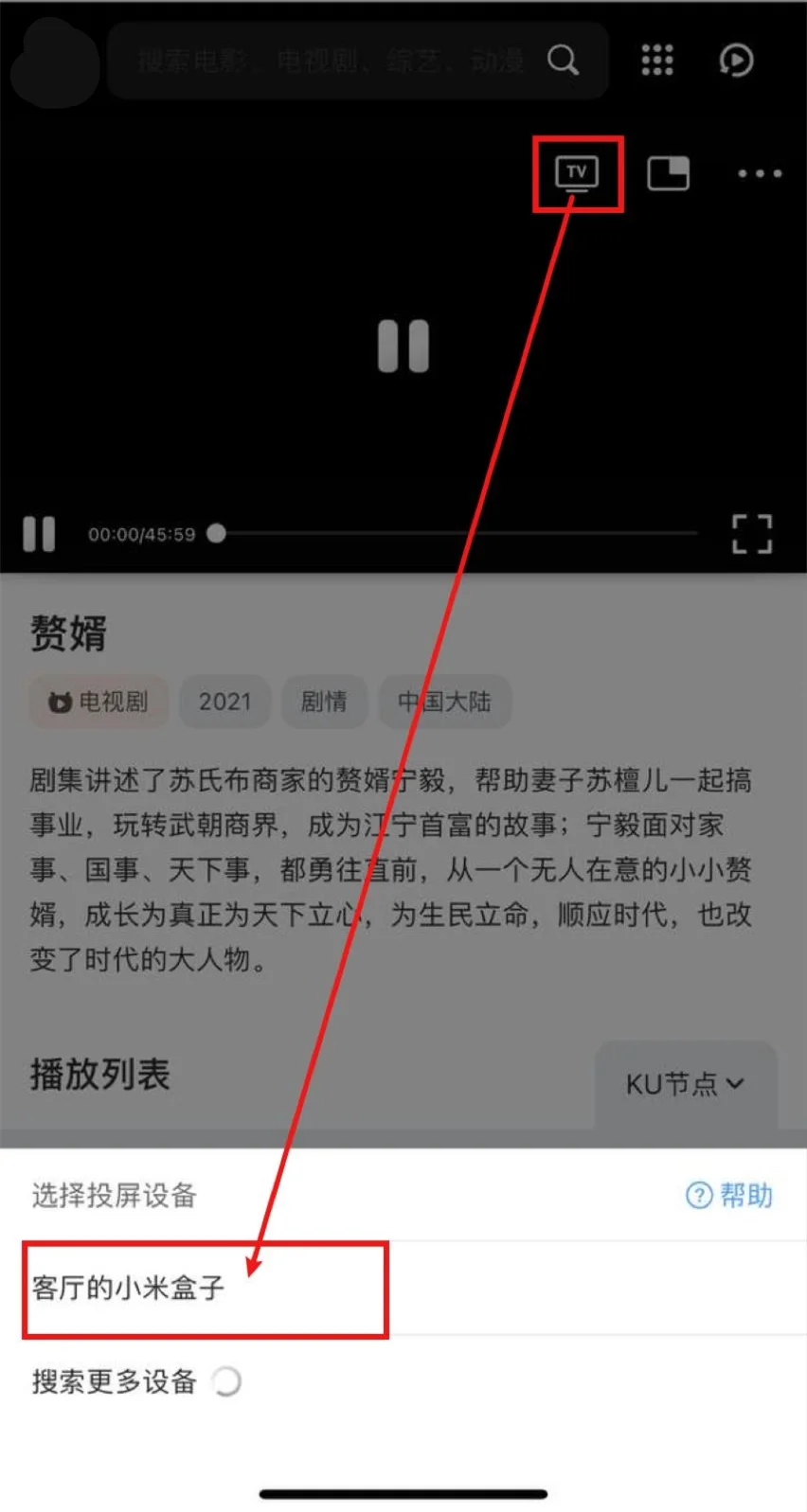 安卓夸克浏览器->打开سەرخىل كىنوخانىسى ->开始播放->全屏->左下角投屏->等待搜寻到智能电视/电视盒子->选中,即可投屏。