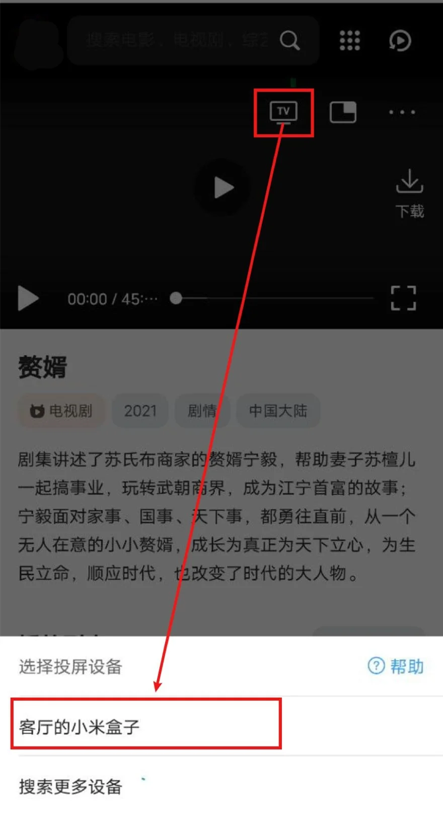 打开QQ浏览器(会接管网页播放器)->打开سەرخىل كىنوخانىسى ->播放视频->选中投屏图标->等待搜寻出智能电视/电视盒子->选中,即可投屏。